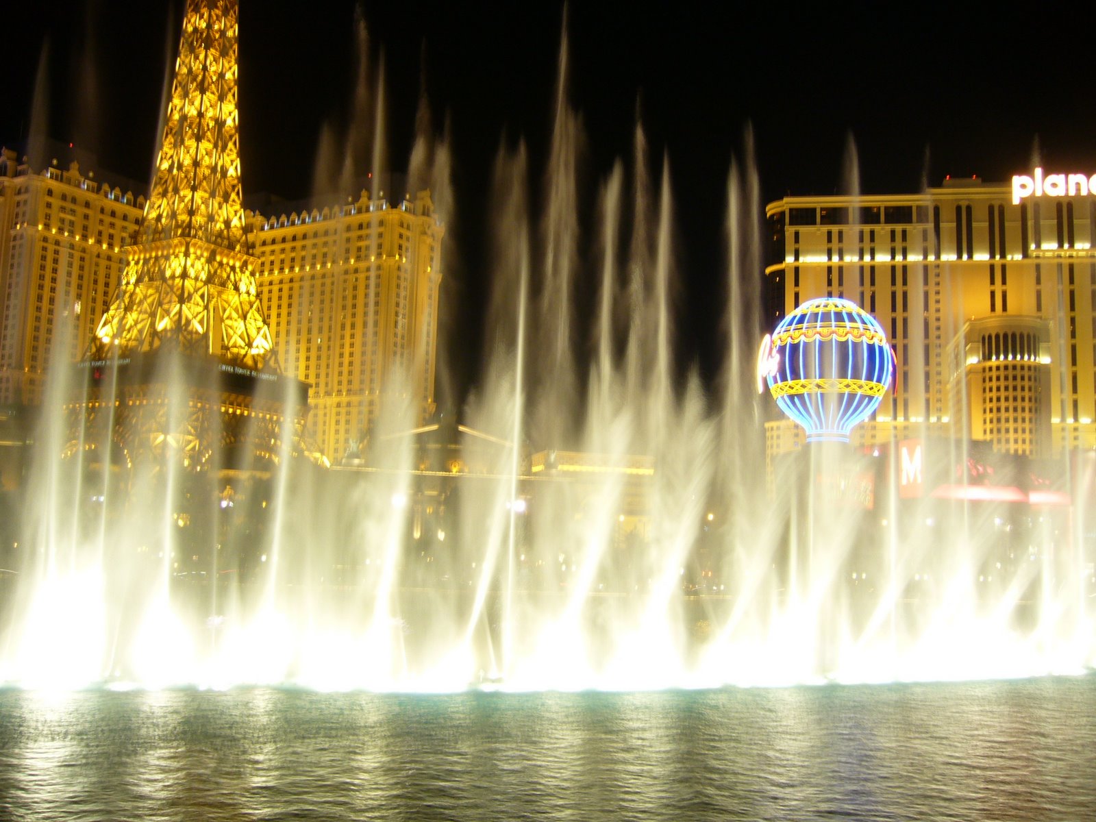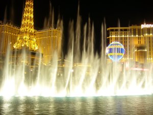 Water Show at Bellagio Hotel Lake. Paris Hotel in the background.