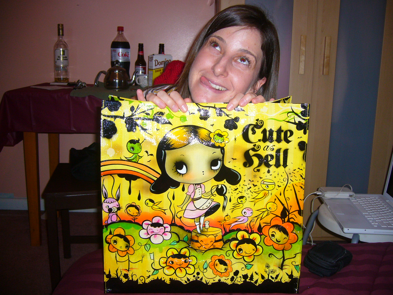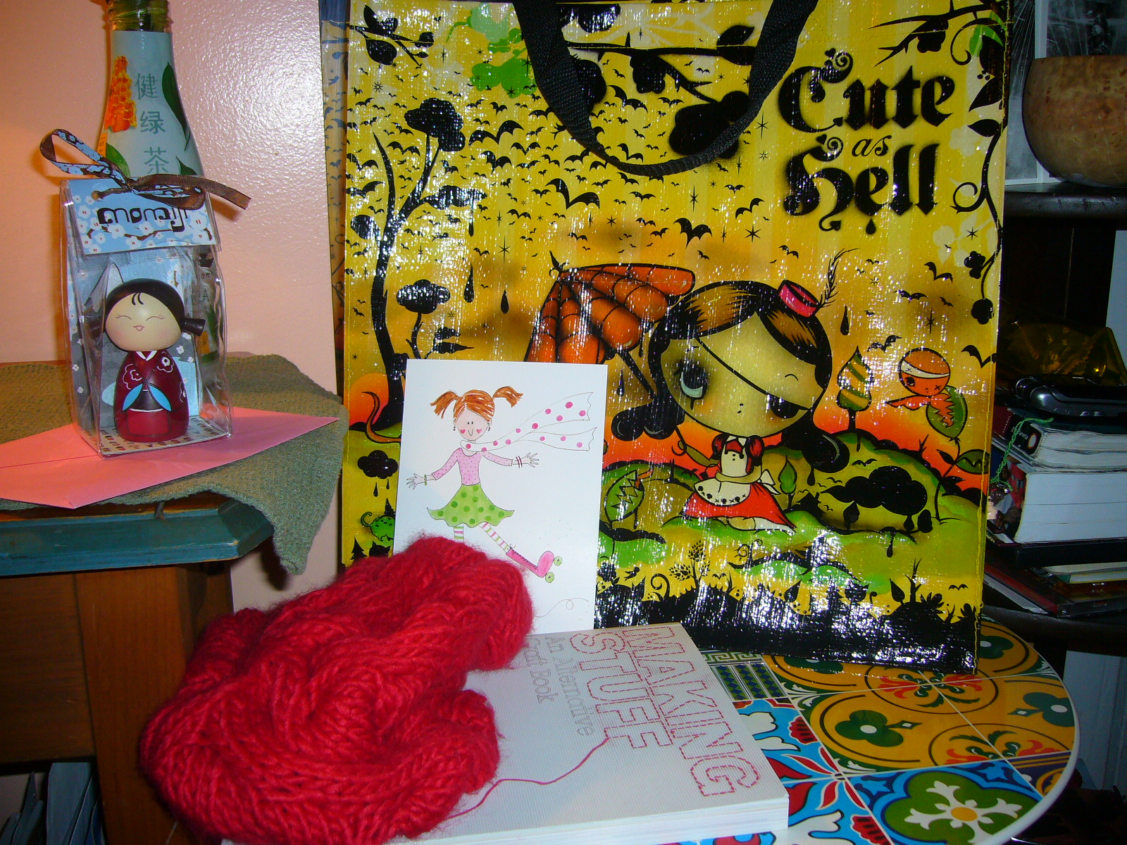 Momo me ha regalado el bolsito, un libro de manualidades y a Giggles (que tiene un mensaje escondido dentro de ella misma). Según lo que pone en el paquete, a Giggles le gusta leer, las mariposas y el rugby 😉
