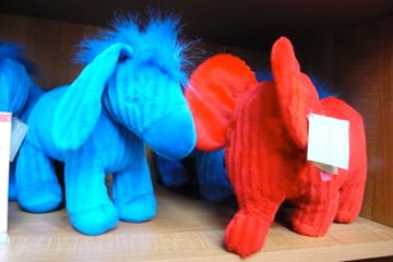 He puesto esta foto de dos peluches que vendían en la juguetería FAO Schwarz, la de la película BIG, porque me parecía una forma muy de andar por casa de pintar a los dos partidos. El burrito azul es el símbolo de los demócratas y el elefante rojo de los republicanos. Se vendían a $21.99 pero este sábado pasado ya estaban de oferta a $9.99 y es que el negocio de las elecciones acaba mañana por la noche.