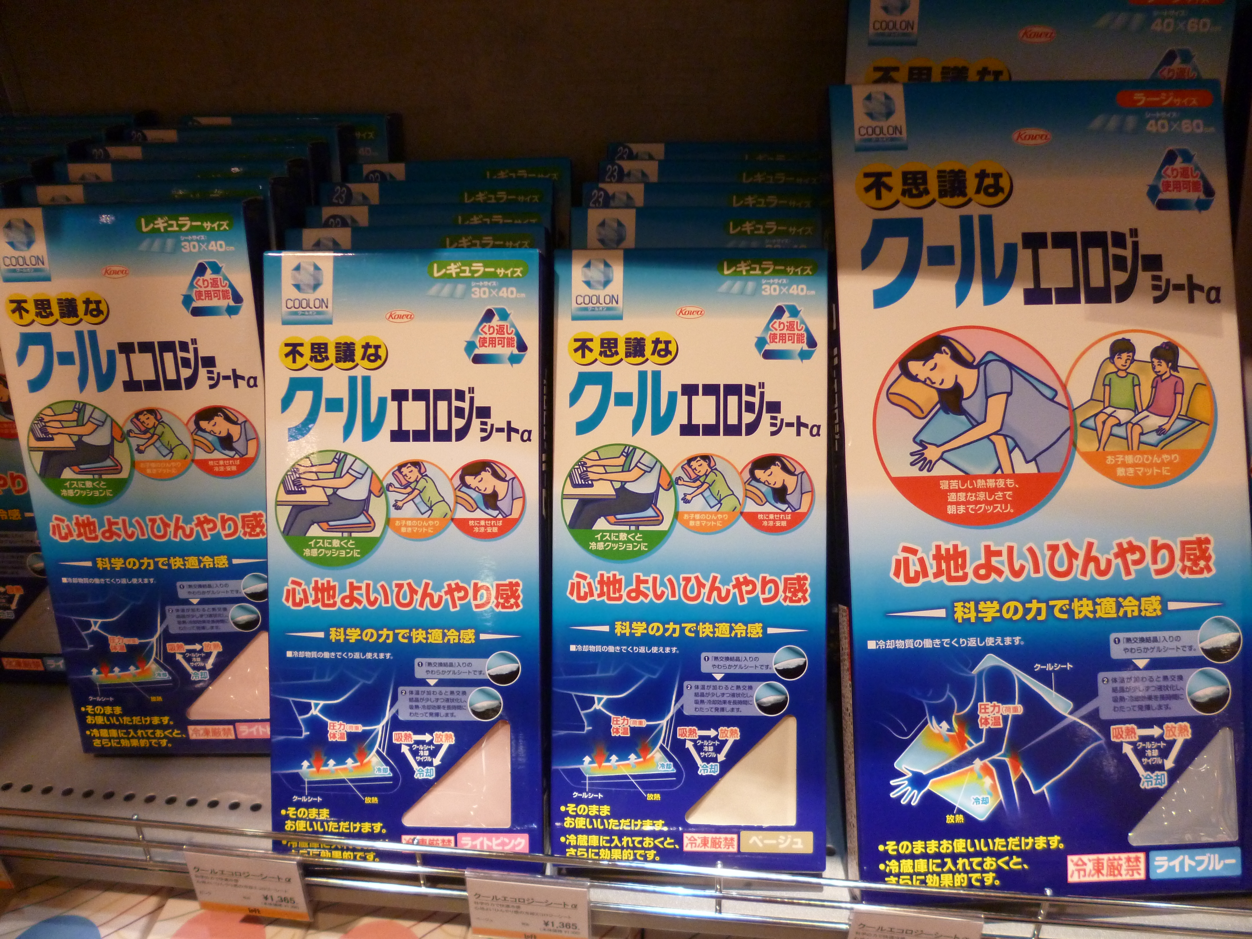 El tercero, las bolsitas de frío no para la nevera sino para refrescarse mientras uno ve la tele, trabaja o duerme. Si, porque estas cosas no son sólo para enfriar las cervezas, sino que pueden ayudar a aliviar este calor tan húmedo y tan inhumano que tienen aquí en estas fechas. Ya antes del terremoto y tsunami del 11m de 2011 debido al precio del petróleo y de la energía, y por el cuidado del medio ambiente?, se empezaron medidas para la reducción del consumo de energía por aire acondicionado. Y después del dramático episodio del año pasado esto se ha intensificado para no tener problemas de abastecimiento.