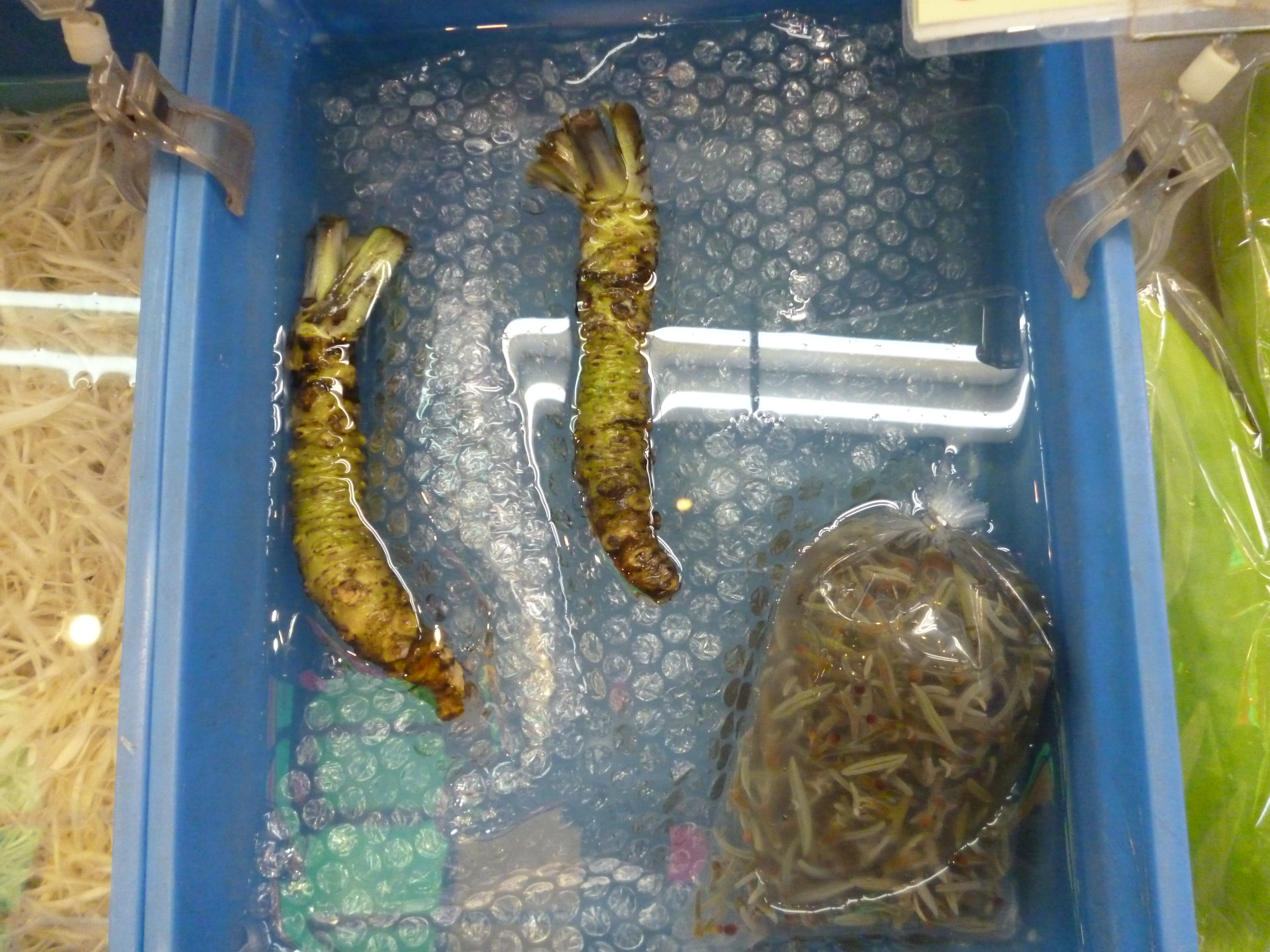 Está claro que para cualquier occidental si hay algo realmente raro, único -mezurashii (珍しい)-dentro de Japón eso es un mercado. En el momento en el que uno se mueve por comercios de alimentos o ingredientes realmente japoneses entra en una dimensión paralela donde: A) Cualquier parecido de la comida con la realidad, bajo nuestros esquemas mentales, es pura coincidencia (véase la reincidencia existente confundiendo la pasta de alubias (anko) por chocolate o el tofu por queso fresco) o, B) La realidad es tal (calamares secos, snacks de gamba …) que cuesta trabajo pensar cuál es modo de consumo de estas cositas. ¿Alguien se ha preguntado alguna vez que pinta tiene el wasabi de verdad? Pues más o menos esta: