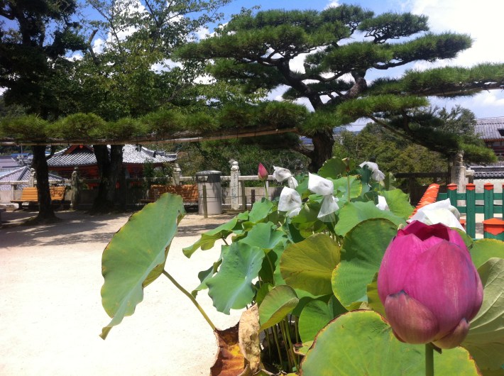 Nuestra primera parada sería en la isla de Ikuchi 生口島, muy conocida por sus campos de cítricos, sus playas, sus olas y por el templo más kitsch del lugar, Kôsan-ji. Su construcción empezó en 1935 comisionada por el devotísimo Kanemoto Kôzô, magnate de los tubos de acero. Este pidió que se recrearan importantes templos todos en un lugar tomo para honrar a su madre.