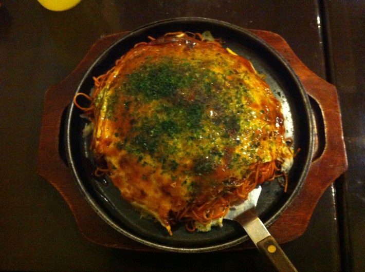 Concluíamos de esta manera nuestro día de coche y turismo, dejando la especialidad local de Hiroshima para la última cena. El okonomiyaki estilo Hiroshima, con fideos dentro, una delicia.