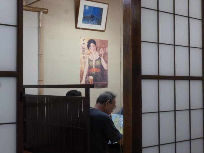 Cliente comiendo, cartel antiguo de cerveza al fondo
