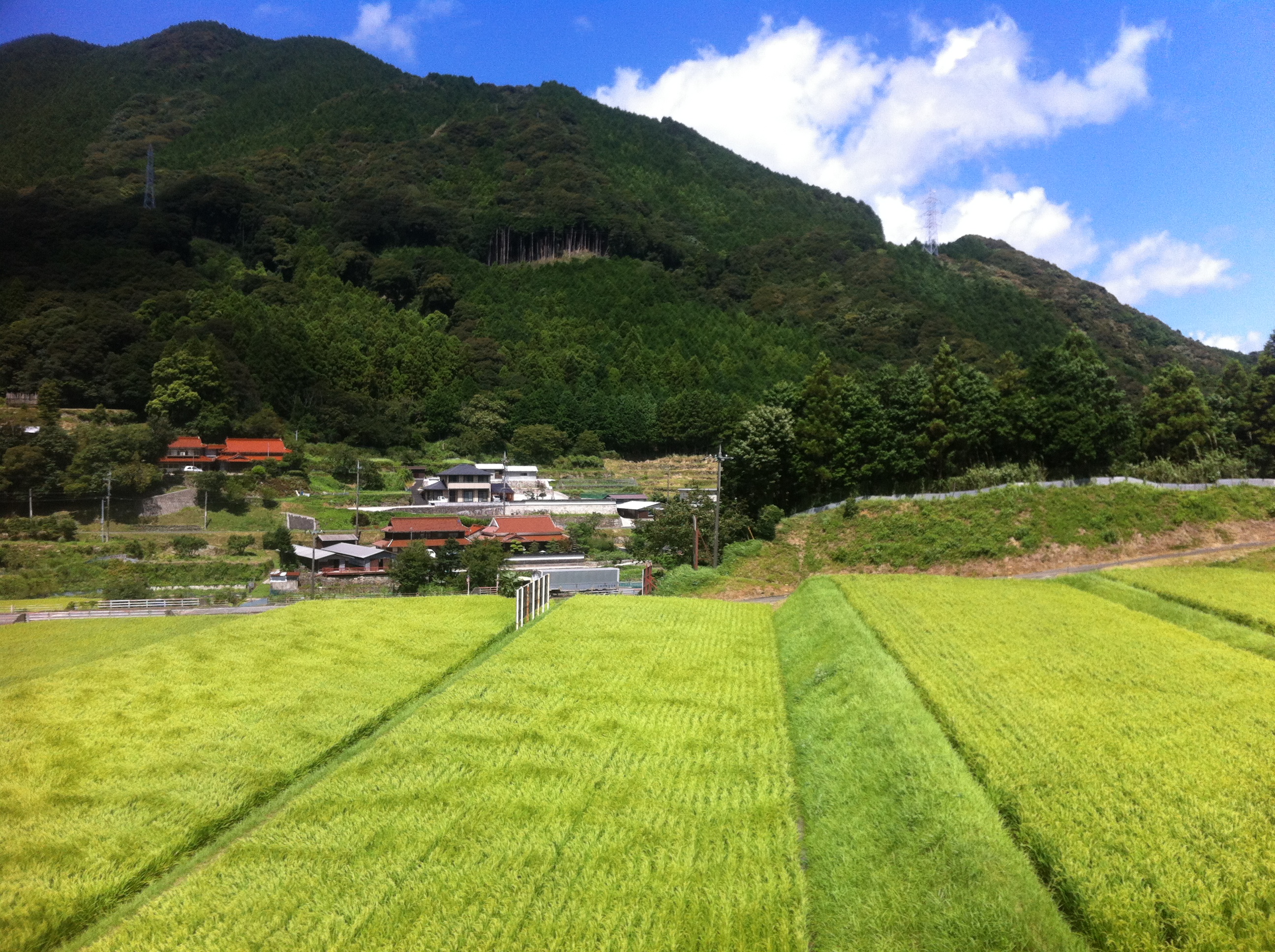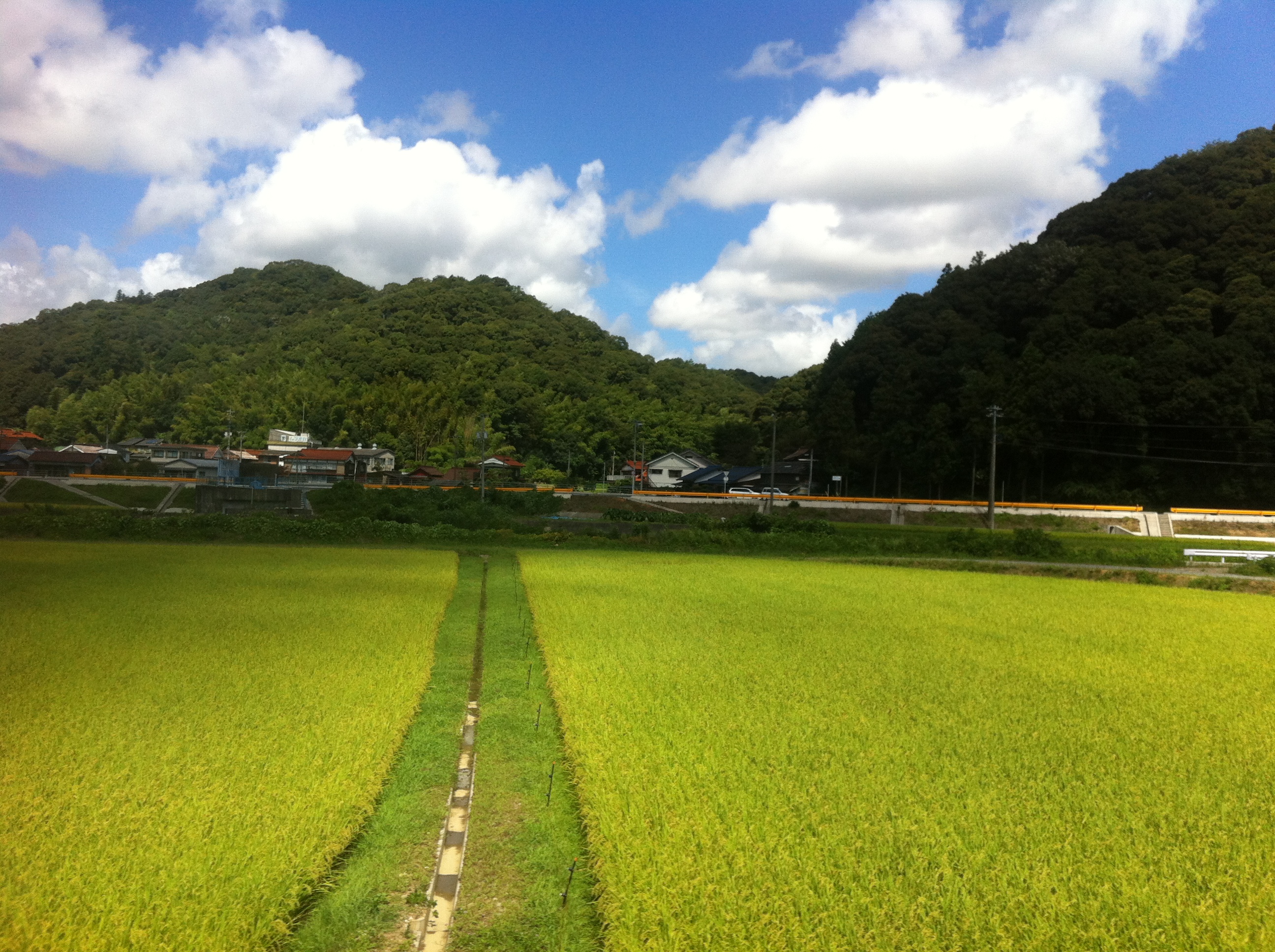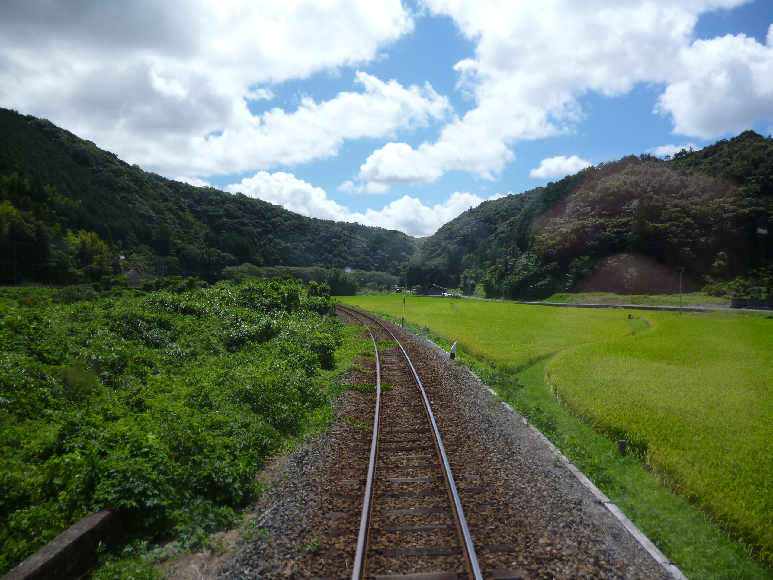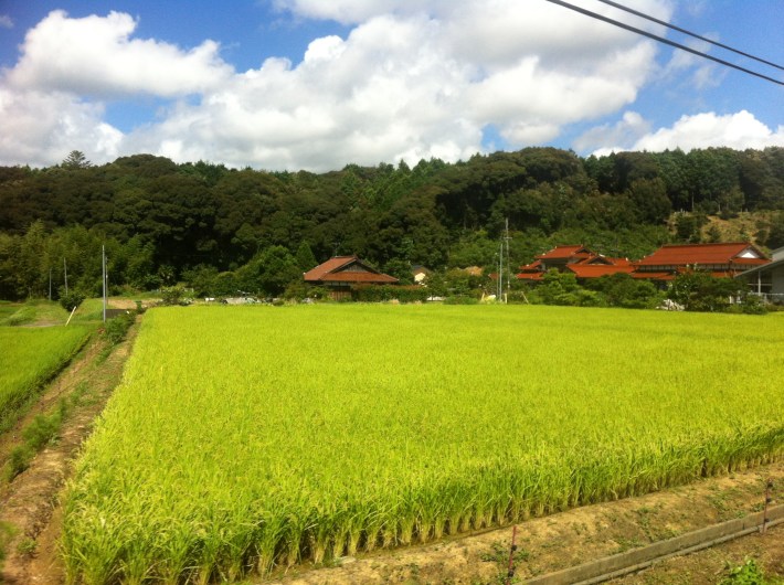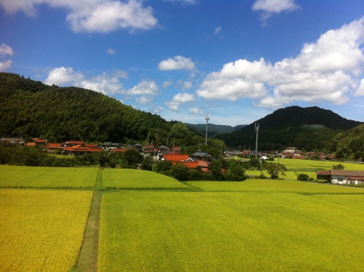 Se suponía que estaba en la vía correcta y que en breve saldría mi tren, pero en la vía solo estaba el tren de playmobil, con su silbato y todo. ¿Cuando se irá el juguetito para dejar sitio a mi tren? Me preguntaba yo. Inocente, 10 minutos antes de la partida de mi tren pregunté a la chica de los tornos, ¿y cual fue la respuesta? el trenecito de cuerda era el que me tenía que llevar a mi a Nagato-Yumoto, la estación en la que finalmente cogería el bus al onsen. La cosa se ponía interesante, cuando aquello empezó a moverse tenía la sensación de que en algún sitio había un par de duendes japoneses escondidos, o quizá un par de tanukis, echando carbón a las calderas. El paisaje se iba transformando en un vergel de arroz recién cortado, de medios tallos aún verdes.