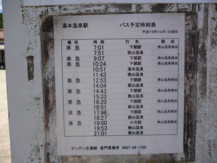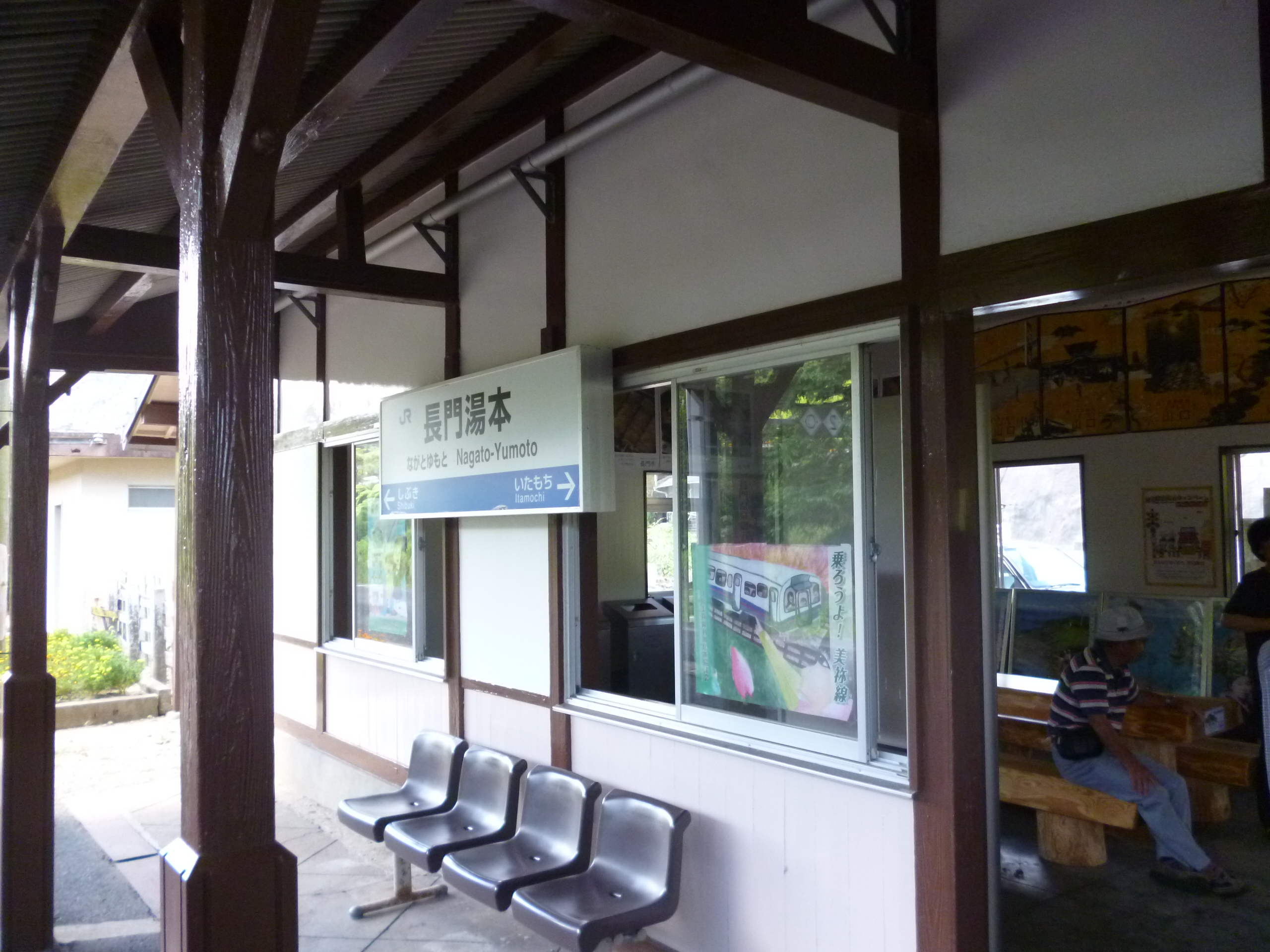 Así con esa confianza que tenemos los imprudentes llegué a Nagato-Yumoto (prefectura de Yamaguchi). En esa estación (ésta era de Pin y Pon, ya ni siquiera de Playmobil) no había nadie, nadie, nadie, así que decidí asaltar a la familia que se bajó conmigo del tren. Yo no pensaba quedarme allí a esperar un tren de vuelta, yo tenía que encontrar la parada del bus que me llevase a mi bañera de agua sulfurosa.