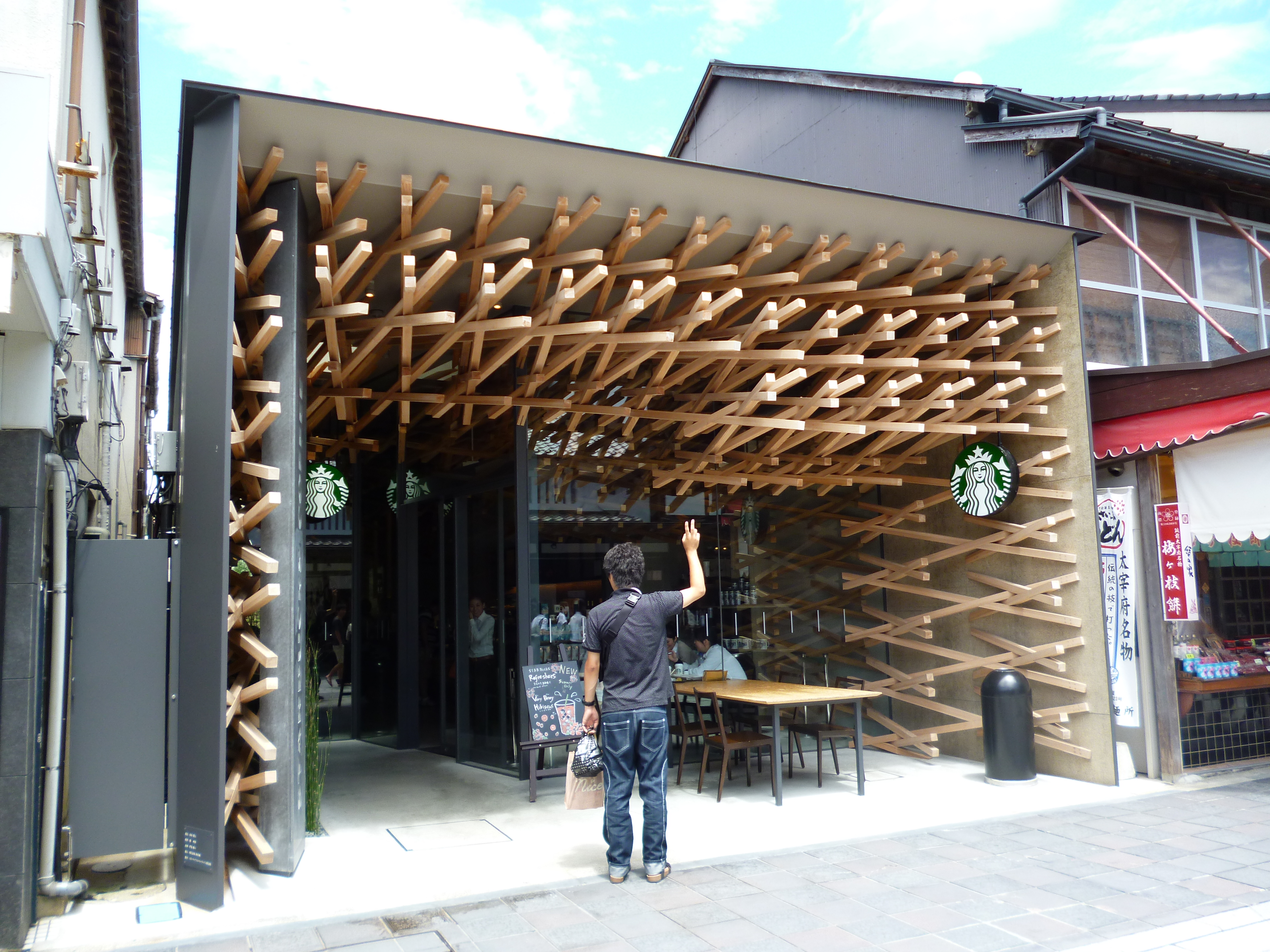 Entre negocios tradicionales se encuentra también este Starbucks obra del arquitecto japonés Kengo Kuma. Una maravilla de espacio en el que el uso de la madera y el protagonismo del pequeño jardín que se avista desde toda la cafetería al fondo, propicia que se sienta el espíritu japonés de una forma muy contemporánea pero sin renunciar a los materiales y a los recursos típicos de su arquitectura.