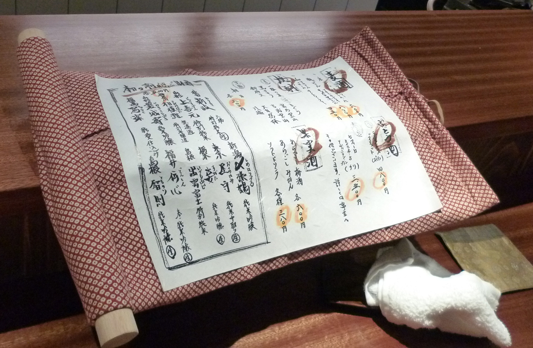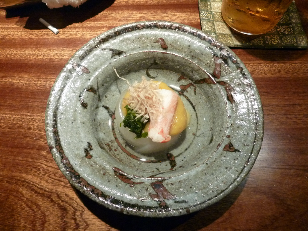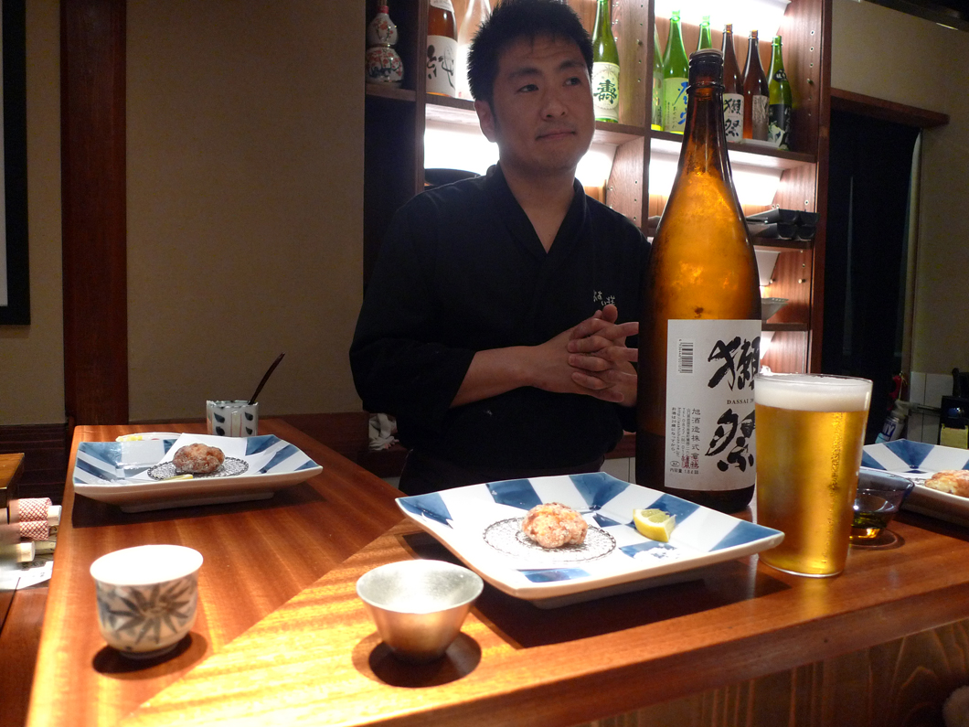 Y así encontramos una especie de casa tradicional, en la que había menús de comida en la puerta pero no tenía ni un rótulo ni nada más que informase. Además, la entrada era un pasillo largo de madera que daba paso a un espacio interior donde había dos puertas, una que comunicaba a un bar muy pequeño con una barra y 5 sillas; y otra completamente ciega a la que llamamos y de la que salió un chef. El chef nos indicó que aquello era Omakase, un restaurante con una fórmula en la que el chef te cocina lo que el quiere y que normalmente suele costar un ojo de la cara, así que nos indicó amablemente que si no teníamos reserva podíamos pasar al otro bar, y allí nos fuimos. Salieron 4 hombres de negocios muy felices y dejaron el lugar vacío, en la habitación Yoshi, Nacho, el cocinero y yo.