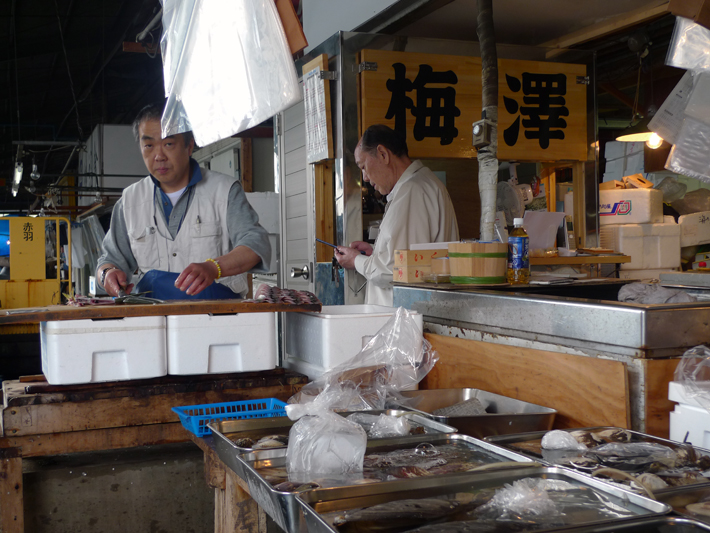 Y si cruzas la explanada esquivando carretillas, llegas a una zona techada pero en su mayor parte abierta por las paredes donde están diferentes los puestos de pescado. La mayoría de esos puestos, y eso es algo extrapolable a otros ámbitos de los negocios y la vida en Japón, están especializados algo: en cierto tipo de pez, molusco o similar. Son los verdaderos especialistas.