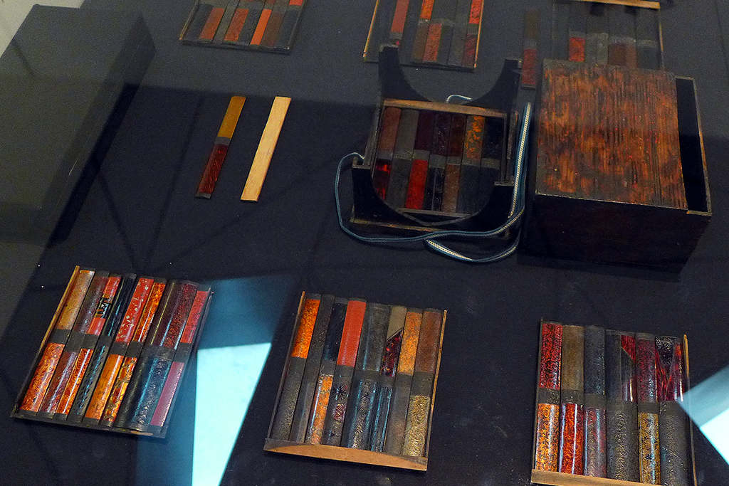 En paralelo a la reproducción de katanas, wakizashi (sable corto), tantô (cuchillo) etc. se podía ver una colección de katanas antiguas junto con piezas originales de materiales con los que se producen: un muestrario precioso de maderas, algunas tsuba (tope a la empuñadura), piel de raya (para la vaina de la espada) etc.